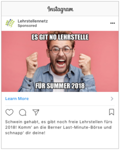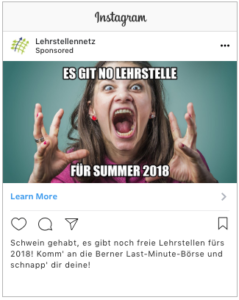 Die jeweils im März stattfindende Last-Minute-Börse des Lehrstellennetzes sollte in diesem Jahr erstmals per Instagram beworben werden. Das Ziel der Kampagne: Jugendliche, die für Sommer 2018 noch keine Lehrstelle im Sack hatten, auf die Börse aufmerksam machen. Ein paar Wochen nach der Last-Minute-Börse erreichte das Lehrstellennetz eine berührende E-Mail einer Mutter eines Jugendlichen. Mehr dazu gleich.
