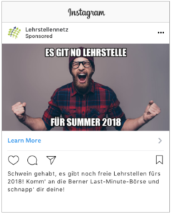 Die jeweils im März stattfindende Last-Minute-Börse des Lehrstellennetzes sollte in diesem Jahr erstmals per Instagram beworben werden. Das Ziel der Kampagne: Jugendliche, die für Sommer 2018 noch keine Lehrstelle im Sack hatten, auf die Börse aufmerksam machen. Ein paar Wochen nach der Last-Minute-Börse erreichte das Lehrstellennetz eine berührende E-Mail einer Mutter eines Jugendlichen. Mehr dazu gleich.